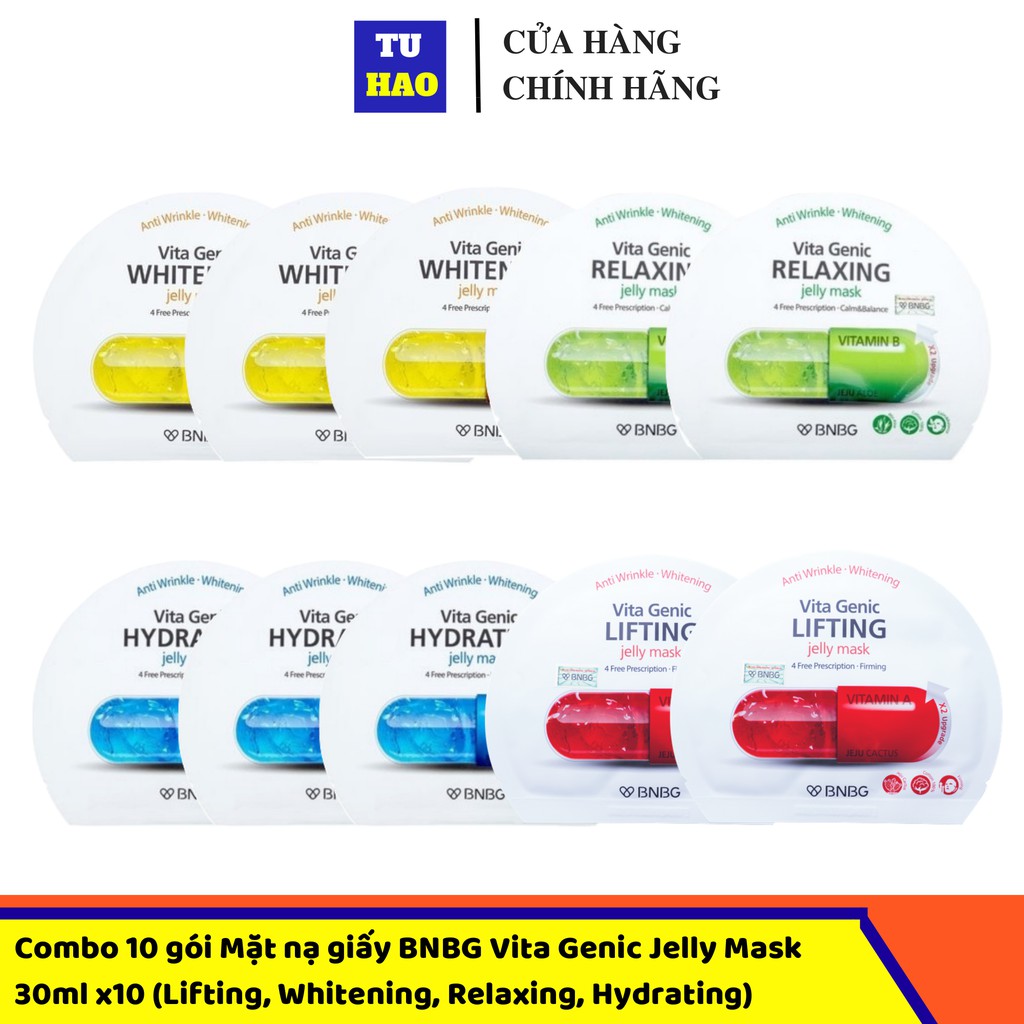 Combo 10 gói Mix 4 loại Mặt nạ giấy BNBG Vita Genic Jelly Mask 30ml x10 (Lifting, Whitening, Relaxing, Hydrating)