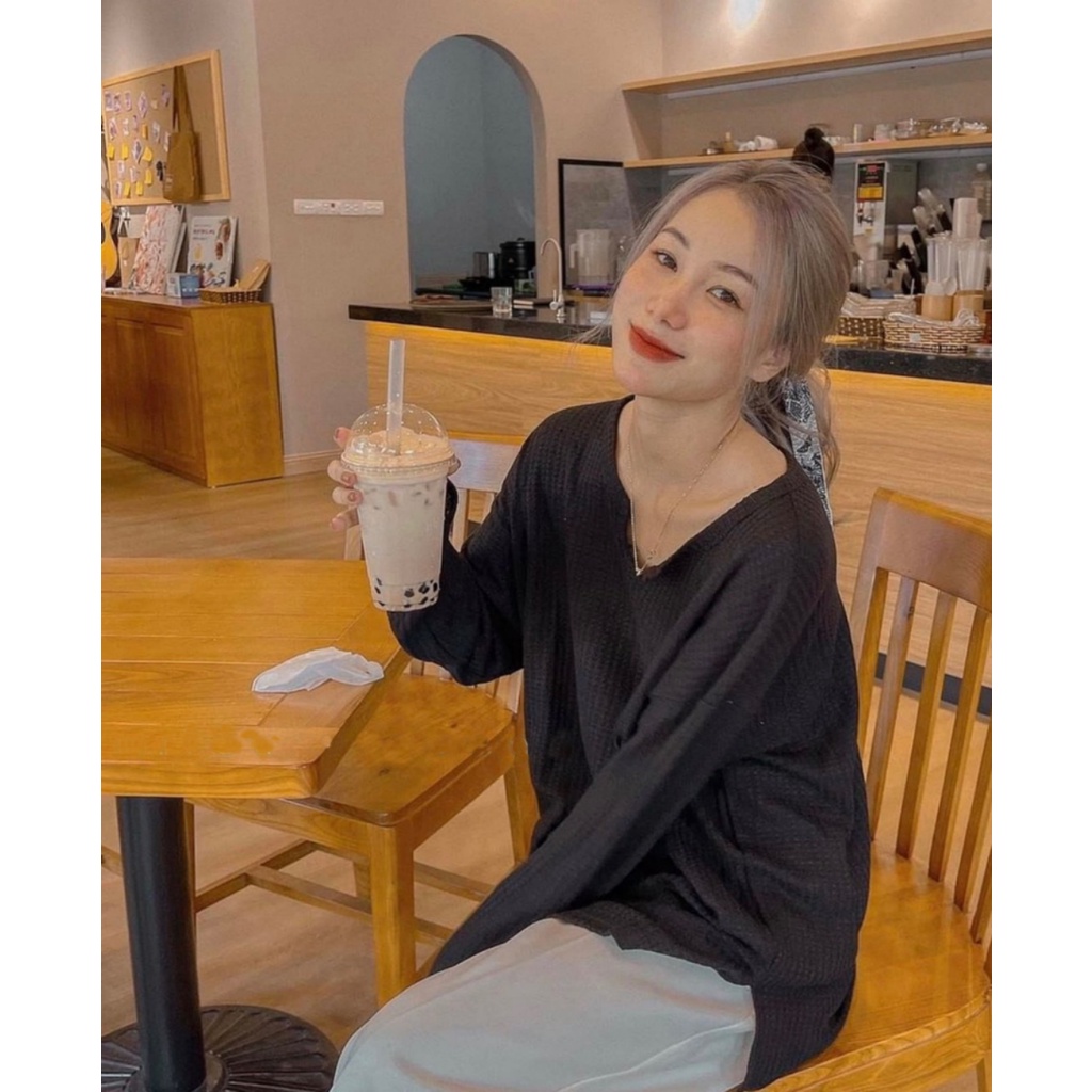 Áo dài tay thun gân cổ U basic oversize xẻ bên ( Ảnh thật )